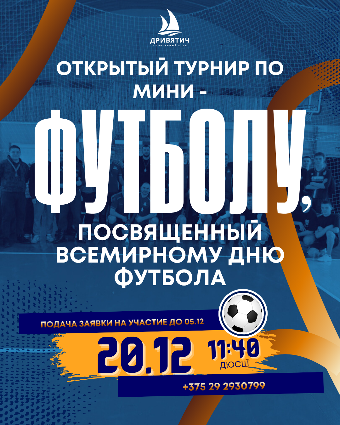 10 декабря во всем мире отмечается Всемирный день футбола! "Дривятич" приглашает на открытый турнир по мини-футболу, посвященный этому дню, для празднования и поздравления всех поклонников лучшей игры в мире!
