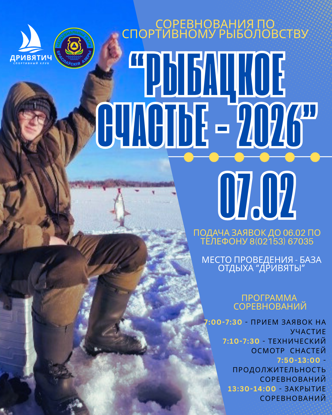 7 февраля "Дривятич" совместно с Национальный-Парк Браславские-Озера приглашает испытать "Рыбацкое счастье - 2026"! Соревнования по спортивному рыболовству пройдут на территории г. Браслава, оз. Дривяты, база отдыха "Дривяты".